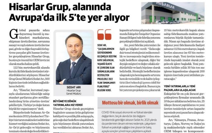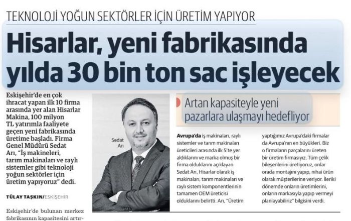 Operational ExcellenceHisarlar is an important solution partner and OEM manufacturer for customers by processing 30 thousand tons of sheet metal annually with its competent staff and high-tech infrastructure striving for excellence, providing high quality, on-time delivery and design support to its business partners for the construction machinery, rail systems and agricultural machinery sectors. -